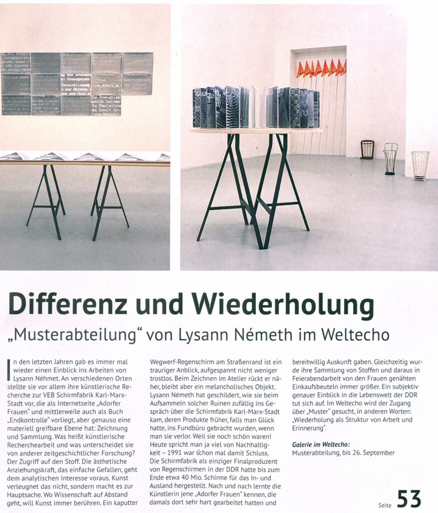 „See the unseen“ – also, frei übersetzt, „Entdecke das Unentdeckte“, ist das Motto des Kulturhauptstadt-Jahres 2025 in Chemnitz. Das Buch „Endkontrolle“ aus dem Verlag Trottoir Noir ermöglicht solch eine Entdeckung. Denn darin begibt sich die Chemnitzer Künstlerin Lysann Németh auf die Spur der einzigen Schirmfabrik der DDR, dem VEB Schirmfabrik Karl-Marx-Stadt. Die hatte auch im Erzgebirgischen Adorf einen Standort. Eva Gaeding stellt unser Sachbuch der Woche vor, es heißt: „Endkontrolle. Über die Arbeit der Frauen in der Schirmfabrik Adorf“. (zitiert nach: MDR-Kultur, 26.03.2025)